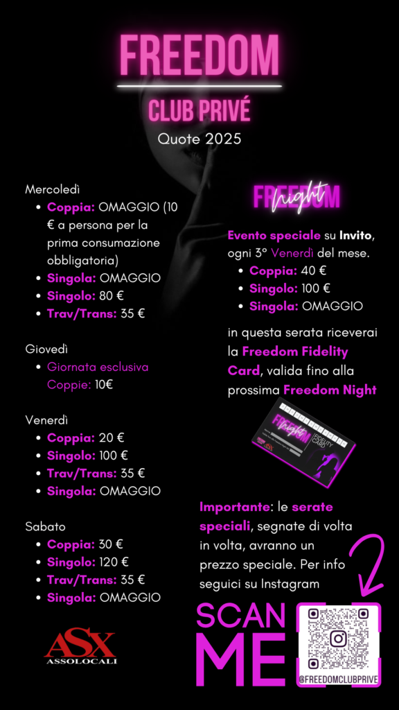 Il Club Privé Freedom a Minerbio si distingue per la sua atmosfera sofisticata, che offre un mix perfetto di eleganza e comfort. Con spazi pensati per garantire la massima riservatezza, il nostro club è il punto di riferimento per chi cerca incontri esclusivi, eventi privati e serate di divertimento in un contesto sicuro e controllato.